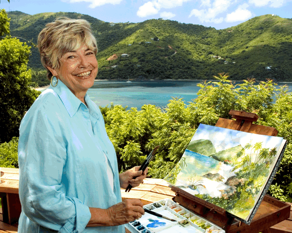 She has studied with David Millard, Judi Betts, James Godwin Scott, Jeanne Dobie and Carolyn Lord. Four of her paintings were chosen to hang on the walls of the Legislative Council of the British Virgin Islands and one of her paintings is on display at Government House. During a recent visit to the BVI, the Duke of Gloucester purchased one of her paintings. In 2006 15 of her watercolors were included in a show in London at BVI House and in 2015 she had a one woman show of her work at the Old Sugar Works Museum in Tortola. Her works are also in private collections in the United States, Canada, England, Italy and Austria as well as in the Caribbean.